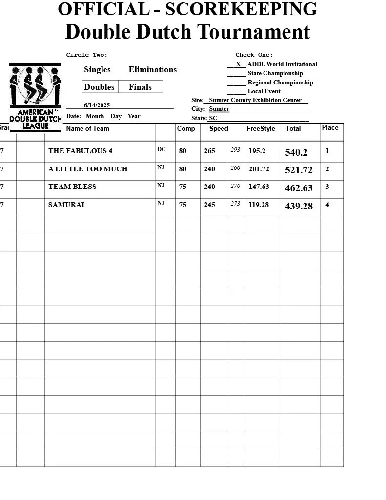 Stay in the loop with the latest competition results, team rankings, and tournament highlights from the American Double Dutch League™. Check back regularly for updated scores and to see how your favorite teams are stacking up!